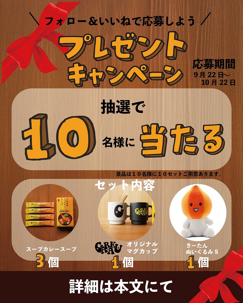 賞品:GARAKUオリジナルマグカップ&きーたんぬいぐるみ&北海道スープカレースープ(10名様)