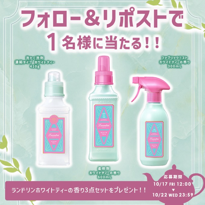 賞品:ランドリン ホワイトティーの香りの洗剤・柔軟剤・ファブリックミスト3点セット(1名様)