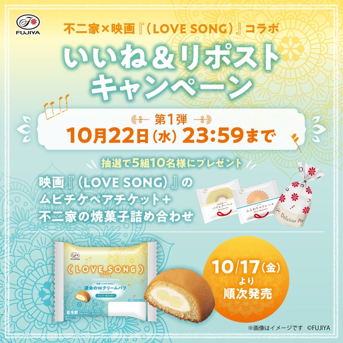 【X懸賞】映画『(LOVE SONG)』ムビチケペアチケットと不二家の焼菓子詰め合わせを5組10名様にプレゼント 2025.10.20不二家‐いいね&リポストキャンペーン第1弾 賞品:映画『(LOVE SONG)』ムビチケペアチケットと不二家の焼菓子詰め合わせ(5組10名様) 締切:2025年10月22日(水)投稿にいいね&リポストで応募📲※詳細はキャンペーンページにてご確認ください。応募はこちらから