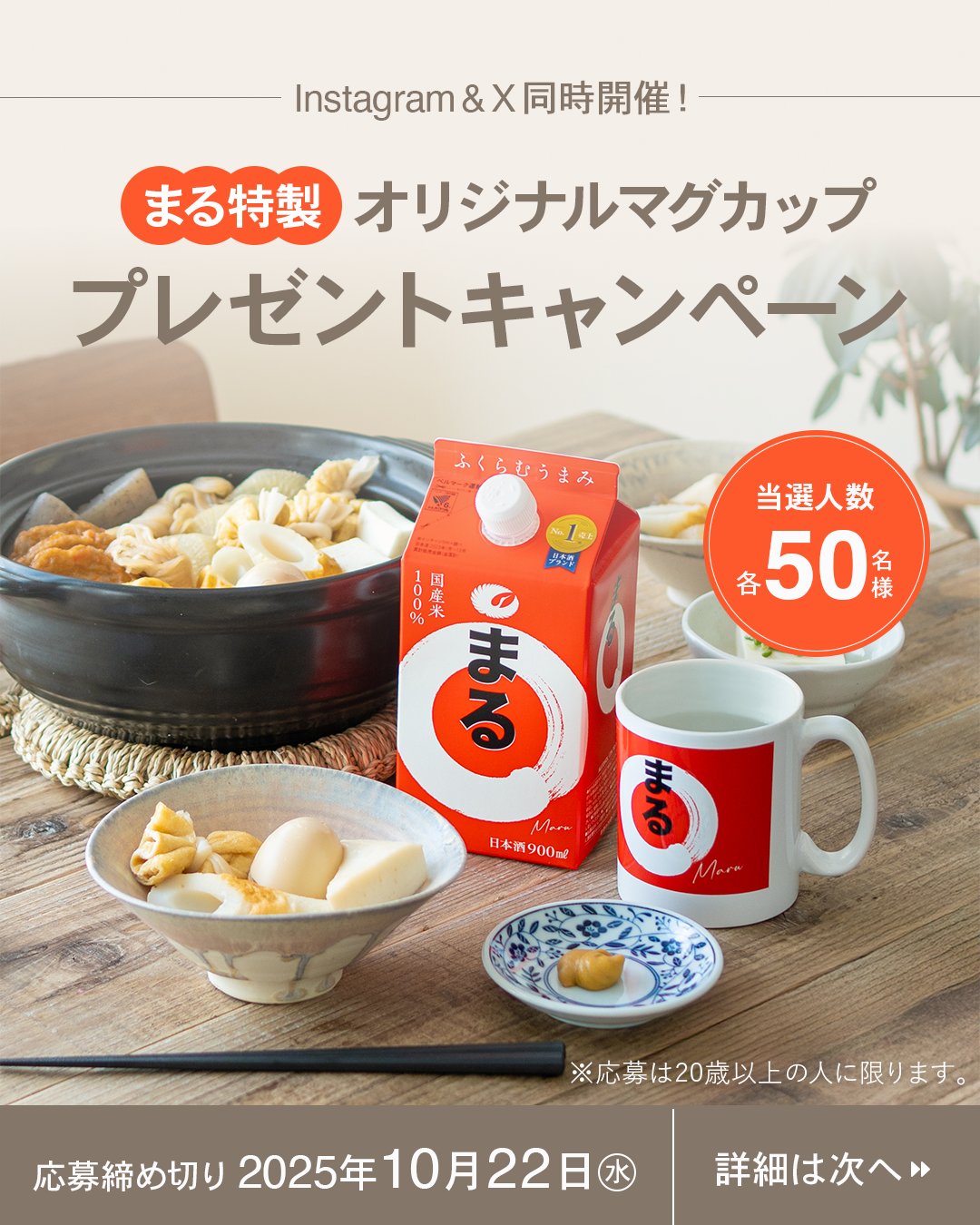 【X・Instagram懸賞】白鶴「まる」900ml&オリジナルマグカップを50名様にプレゼント 2025.10.20白鶴酒造‐プレゼントキャンペーン 賞品:白鶴「まる」900ml×1本&オリジナルマグカップ×1個(50名様) 締切:2025年10月22日(水)公式X(Twitter)アカウントをフォロー&キャンペーン対象ポストをリポストしてご応募ください。Instagramからも応募できます。※詳細はキャンペーンページにてご確認ください。応募はこちらから
