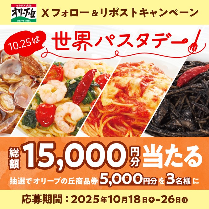 イタリア食堂 オリーブの丘公式X(Twitter)アカウントをフォロー&キャンペーン対象ポストをリポストしてご応募ください。