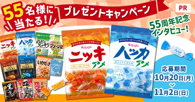 春日井製菓のお菓子11種詰め合わせを55名様にプレゼント 2025.10.21お菓子と、わたし‐読者限定プレゼントキャンペーン 賞品:春日井製菓のお菓子11種詰合せ(55名様) 締切:2025年11月2日(日)アンケートに答えてご応募ください。※詳細はキャンペーンページにてご確認ください。応募はこちらから