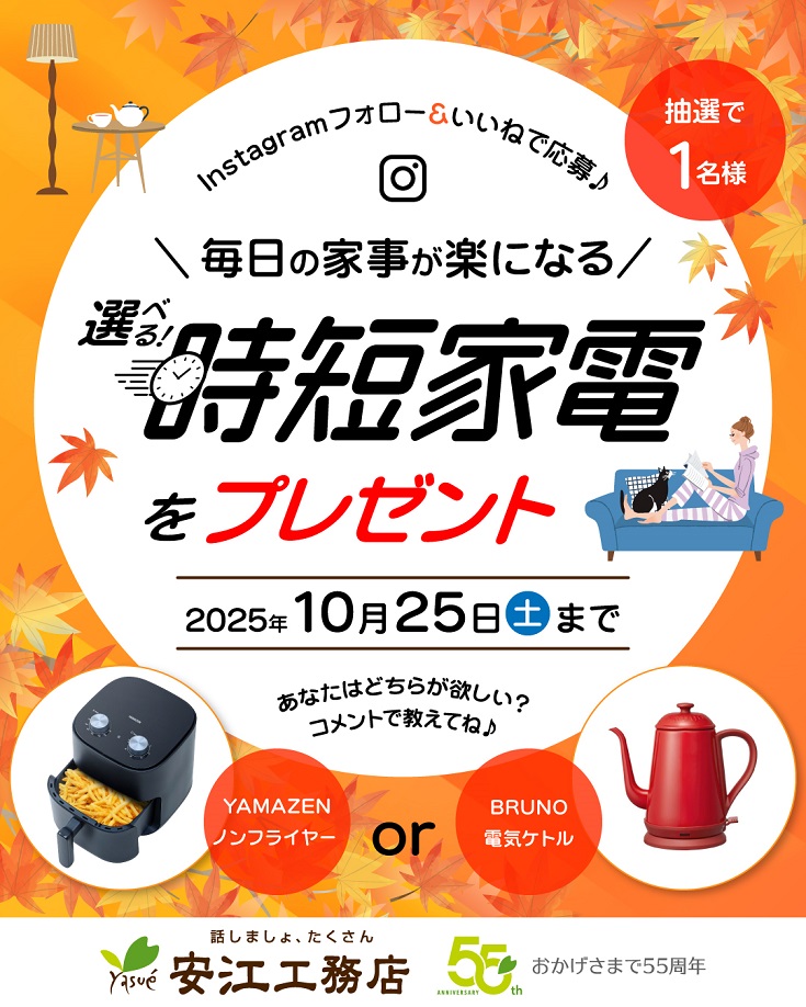賞品:YAMAZEN ノンフライヤー、BRUNO 電気ケトル(1名様)