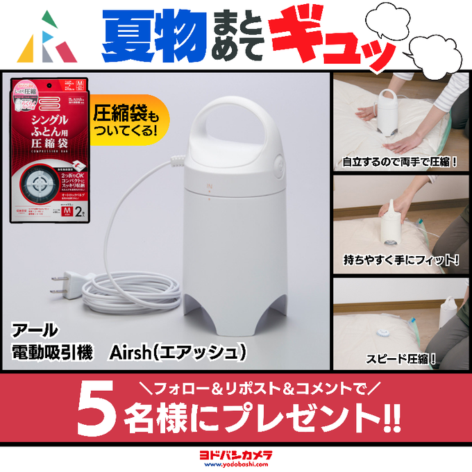 【X懸賞】アール「電動吸引機 Airsh」を5名様にプレゼント 2025.10.22ヨドバシカメラ‐プレゼントキャンペーン 賞品:アール「電動吸引機 Airsh(エアッシュ)」(5名様) 締切:2025年10月24日(金)👉フォロー&リポスト&コメント👉10/24まで※詳細はキャンペーンページにてご確認ください。応募はこちらから