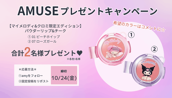 賞品:アミューズ マイメロディ&クロミ限定エディション パウダーリップ&チーク(2名様)