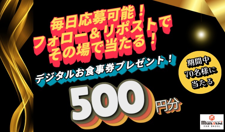 賞品:定食屋 宮本むなしでご利用いただけるデジタルお食事券500円分(70名様)