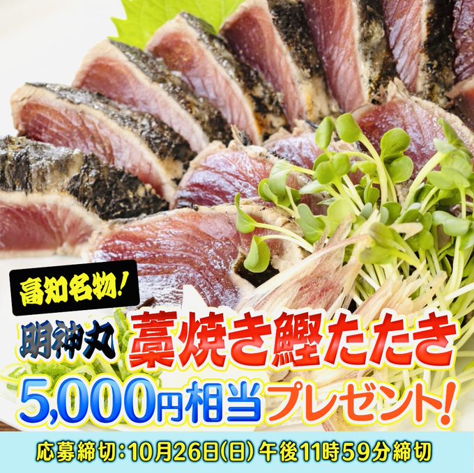 【X懸賞】高知名物!藁焼き 鰹のたたきを2名様にプレゼント 2025.10.23「旬感LIVEとれたてっ!」プレゼントキャンペーン 賞品:高知名物!藁焼き 鰹のたたき(2名様) 締切:2025年10月26日(日)応募方法 ①『#とれたてっ!』公式Xをフォロー ②投稿をリポストまたは引用リポスト※詳細はキャンペーンページにてご確認ください。応募はこちらから