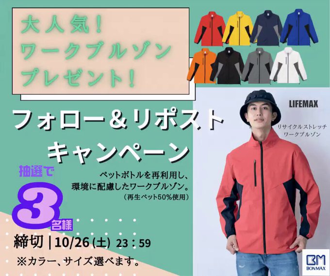 【X懸賞】ワークブルゾンを3名様にプレゼント 2025.10.23ボンマックス‐フォロー&リポストキャンペーン 賞品:ワークブルゾン(3名様) 締切:2025年10月26日(日)公式X(Twitter)アカウントをフォロー&キャンペーン対象ポストをリポストしてご応募ください。※詳細はキャンペーンページにてご確認ください。応募はこちらから