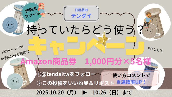 【X懸賞】Amazonギフト券1,000円分を5名様にプレゼント 2025.10.23株式会社テンダイ‐プレゼントキャンペーン 賞品:Amazonギフト券1,000円分(5名様) 締切:2025年10月26日(日)1️⃣@tendaitwをフォロー 2️⃣投稿をいいね&リポスト※詳細はキャンペーンページにてご確認ください。応募はこちらから