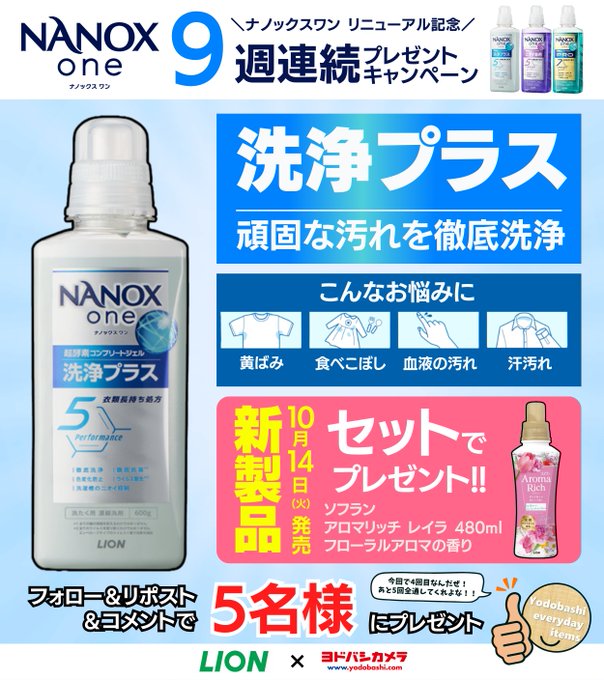 【X懸賞】NANOX one 洗浄プラス&ソフラン アロマリッチ レイラを5名様にプレゼント 2025.10.23ヨドバシ@日用品専門‐プレゼントキャンペーン 賞品:NANOX one 洗浄プラス&ソフラン アロマリッチ レイラ(5名様) 締切:2025年10月26日(日)👉フォロー&リポスト&コメント👉10/26迄※詳細はキャンペーンページにてご確認ください。応募はこちらから