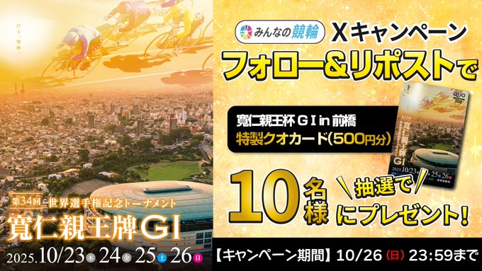 【X懸賞】特製クオカードを10名様にプレゼント 2025.10.23みんなの競輪‐『寛仁親王牌G1』PRキャンペーン 賞品:特製クオカード(10名様) 締切:2025年10月26日(日)公式X(Twitter)アカウントをフォロー&キャンペーン対象ポストをリポストしてご応募ください。※詳細はキャンペーンページにてご確認ください。応募はこちらから