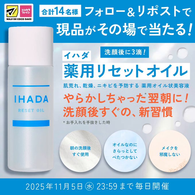 賞品:イハダ 薬用リセットオイル(14名様)