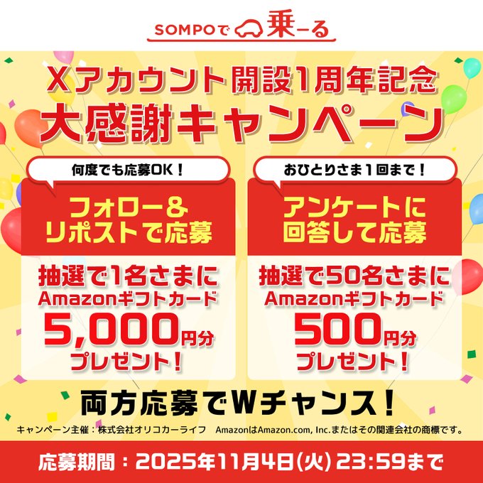 SOMPOで乗ーる Xアカウント開設1周年記念 大感謝キャンペーン