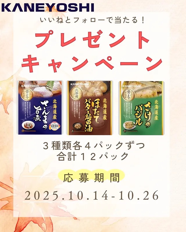 賞品:さんまの旨煮、ほたてのバター醤油、さけのバジルを各4パックずつ合計12パック(10名様)