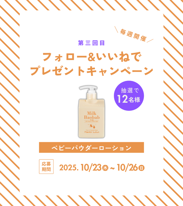 フォロー&いいねで #ミルクバオバブ 「ベビーパウダーローション」を抽選で12名様にプレゼント!