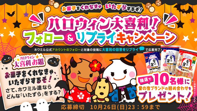 【X懸賞】雪の宿ブランドの詰め合わせを10名様にプレゼント 2025.10.24ホワミル‐ハロウィン大喜利🎃キャンペーン 賞品:雪の宿 ブランドの詰め合わせ(10名様) 締切:2025年10月26日(日)応募方法 ① @howamiru810をフォロー ② 投稿に大喜利の回答をリプライ※詳細はキャンペーンページにてご確認ください。応募はこちらから