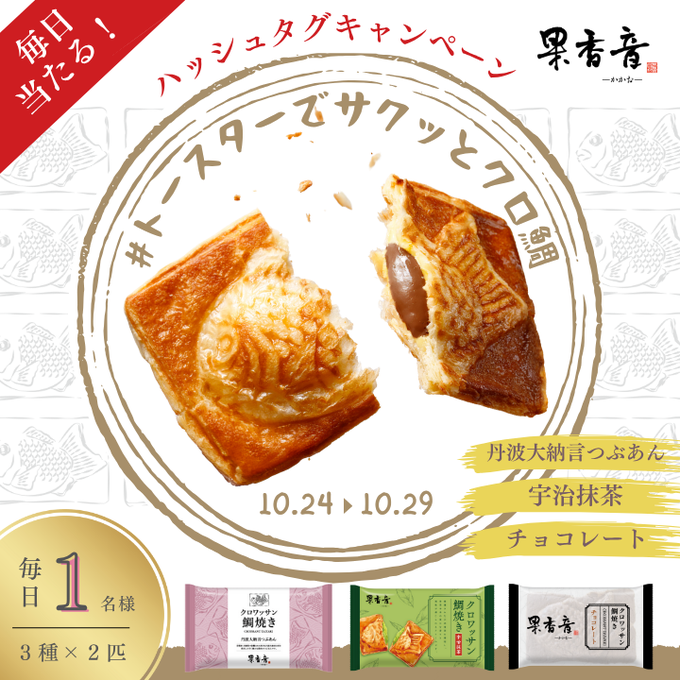 【毎日・X懸賞】果香音のクロワッサン鯛焼き3種を毎日1名様にプレゼント 2025.10.24アサヒ物産‐ハッシュタグキャンペーン 賞品:果香音のクロワッサン鯛焼き3種(毎日1名様) 締切:2025年10月29日(水)応募▶アカウントをフォロー▶#トースターでサクッとクロ鯛 をつけて投稿※詳細はキャンペーンページにてご確認ください。応募はこちらから