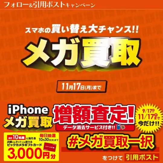 ビックカメラ公式X(Twitter)アカウントをフォロー&キャンペーン対象ポストをリポストしてご応募ください。