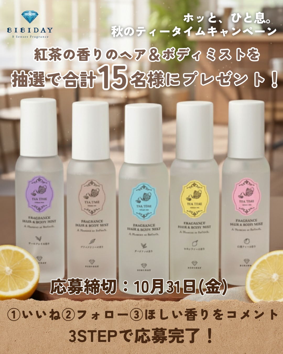 賞品:BIBIDAY TEATIMEフレグランスヘア&ボディミスト(15名様)