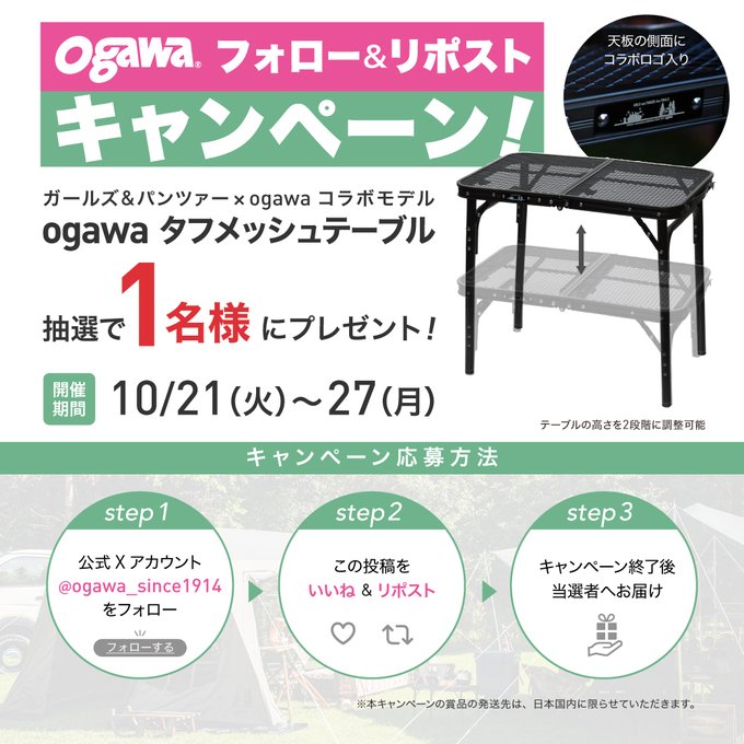賞品:ガールズ&パンツァー×ogawaコラボ タフメッシュテーブル(1名様)