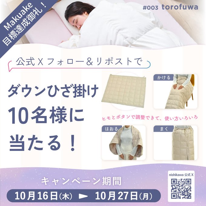 nishikawa(西川株式会社)‐torofuwa Makuake 目標金額達成記念
