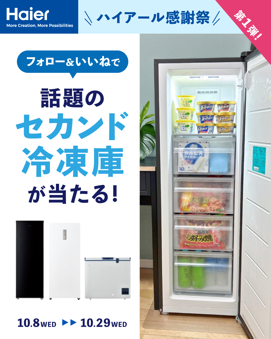 【Instagram懸賞】ハイアールの冷凍庫を1名様にプレゼント 2025.10.26ハイアール感謝祭 賞品:ハイアールの冷凍庫(1名様) 締切:2025年10月29日(水)応募方法: 1. 公式Instagramアカウントをフォロー 2. 対象の投稿に「いいね!」※詳細はキャンペーンページにてご確認ください。応募はこちらから
