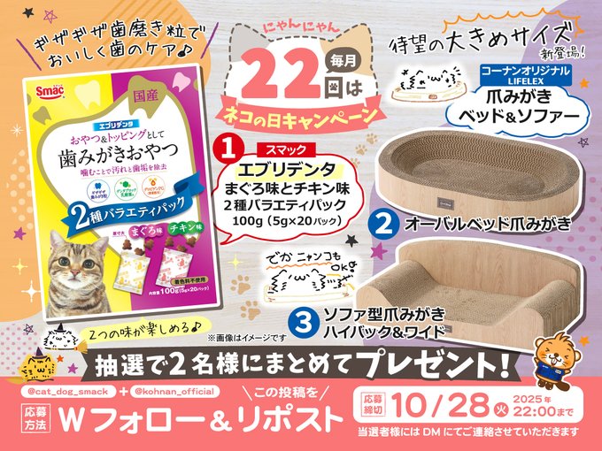 @cat_dog_smack @kohnan_official をフォロー&キャンペーン対象ポストをリポストしてご応募ください。