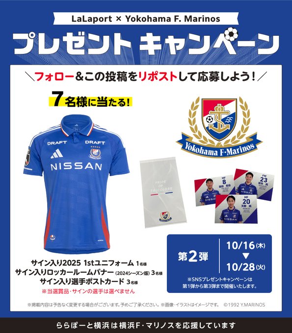 賞品:横浜F・マリノス サイン入りユニフォーム、ロッカールームバナー、ポストカード(7名様)
