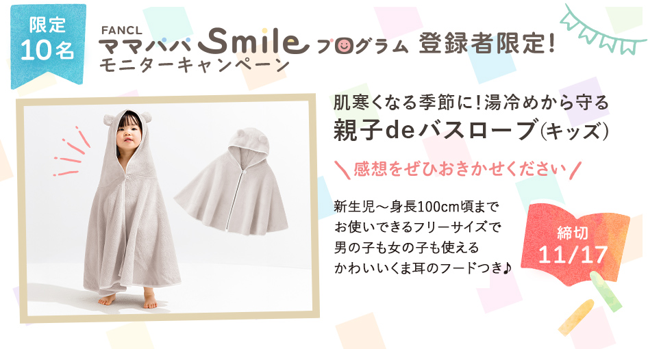 親子deバスローブ(キッズ)を10名様にプレゼント 2025.10.26FANCL ママパパsmileプログラム登録者限定!モニターキャンペーン 賞品:親子deバスローブ(キッズ)(10名様) 締切:2025年11月17日(月)ご応募には会員登録/ログインが必要です。※詳細はキャンペーンページにてご確認ください。応募はこちらから