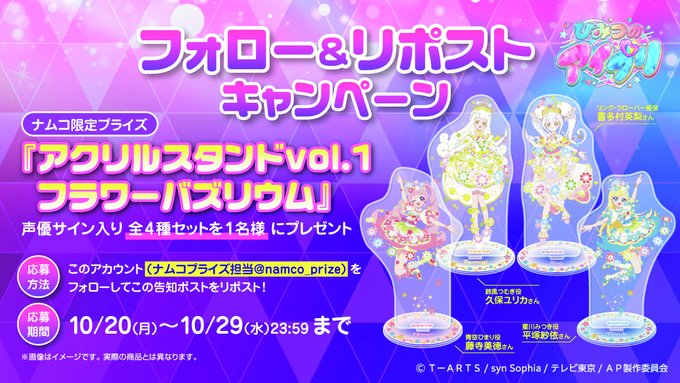 賞品:「ひみつのアイプリ」アクリルスタンドvol.1フラワーバズリウム ナムコ限定声優サイン入り全4種セット(1名様)