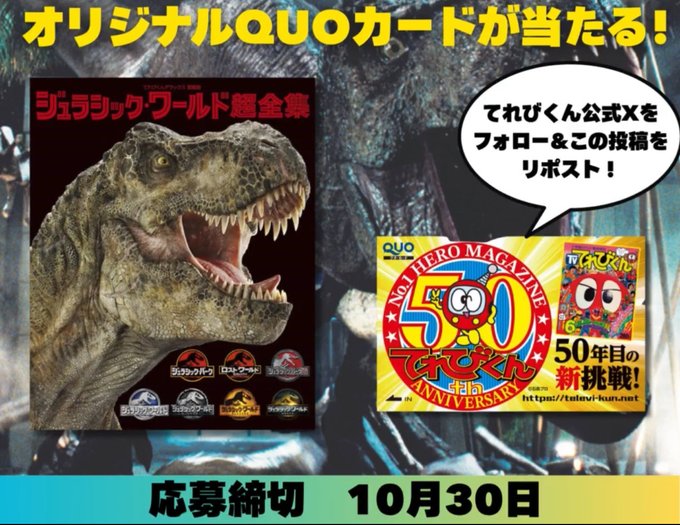 【X懸賞】オリジナルQUOカードを3名様にプレゼント 2025.10.28 2025.10.27てれびくん‐フォロー&リポストキャンペーン 賞品:オリジナルQUOカード(3名様) 締切:2025年10月30日(木)公式X(Twitter)アカウントをフォロー&キャンペーン対象ポストをリポストしてご応募ください。※詳細はキャンペーンページにてご確認ください。応募はこちらから
