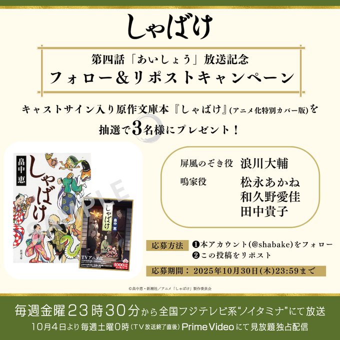 賞品:#浪川大輔 #松永あかね #和久野愛佳 #田中貴子 サイン入りの原作文庫本「しゃばけ」(3名様)