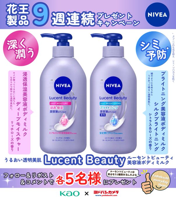賞品:ニベア ルーセントビューティ シルクブライトニング、ディープモイスチャー(10名様)