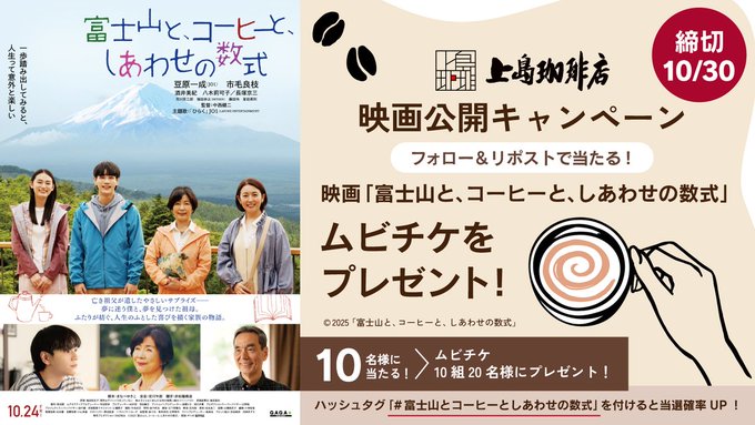 賞品:映画『富士山と、コーヒーと、しあわせの数式』ムビチケ(10組20名様)