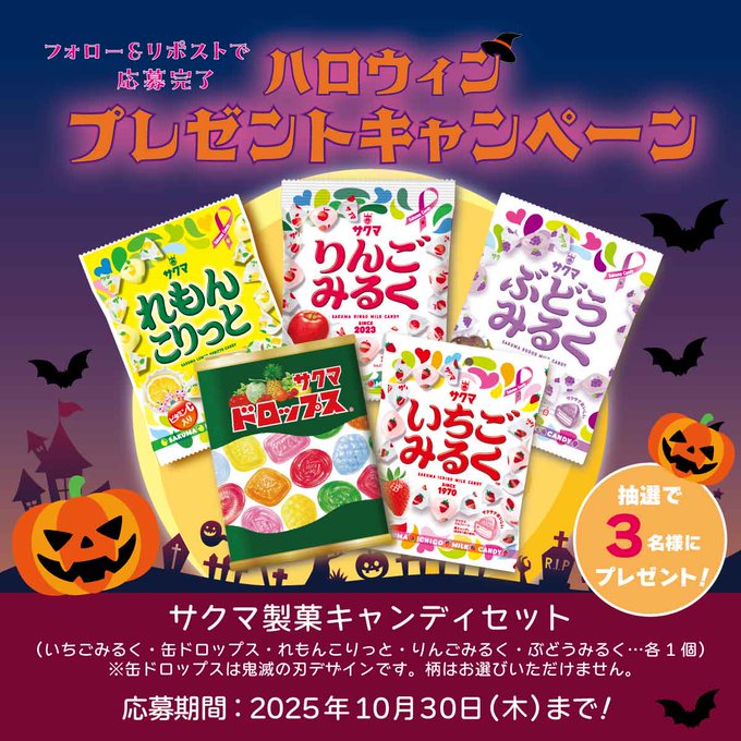 【X懸賞】サクマキャンディセットを3名様にプレゼント 2025.10.28 2025.10.27サクマ製菓‐ハロウィンキャンペーン 賞品:サクマキャンディセット(3名様) 締切:2025年10月30日(木)公式X(Twitter)アカウントをフォロー&キャンペーン対象ポストをリポストしてご応募ください。※詳細はキャンペーンページにてご確認ください。応募はこちらから
