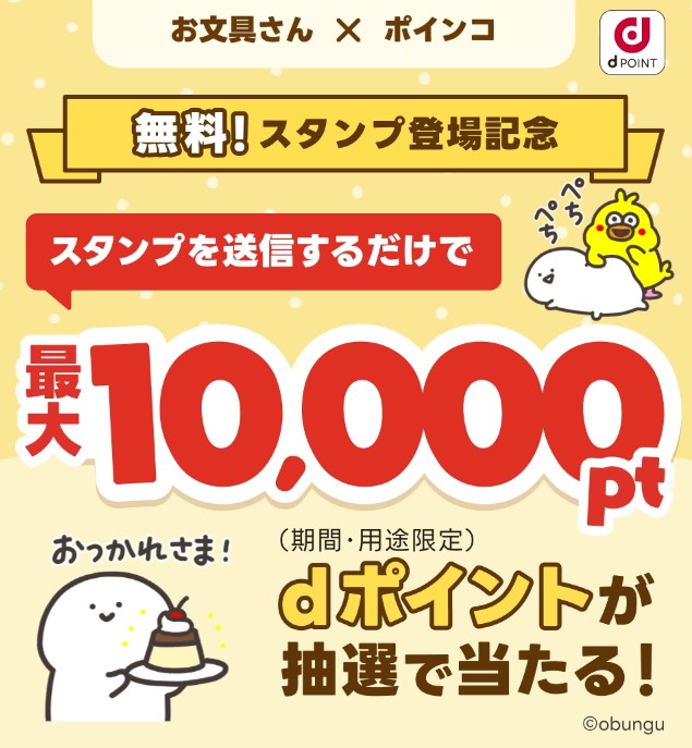 お文具さん×ポインコの期間限定LINEスタンプをダウンロードし、トークルームにて対象スタンプを送信すると、抽選でdポイントが当たる!