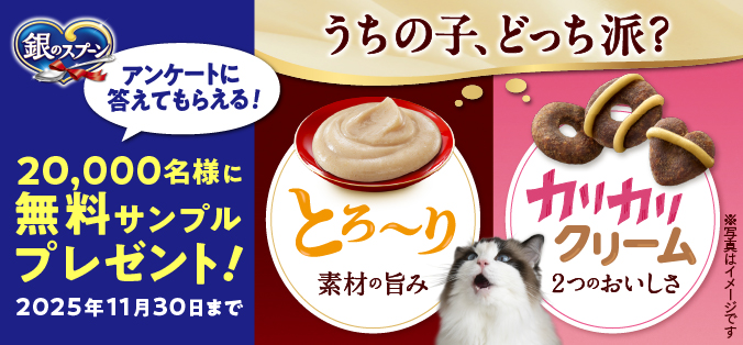 賞品:『銀のスプーン にっぽんselectとろリッチ 48g』もしくは『銀のスプーン お魚味クリームどーにゃつ 24g』のおやつを1パック(20,000名様)
