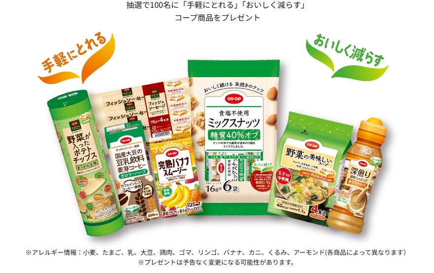 「手軽にとれる」「おいしく減らす」コープ商品を100名様にプレゼント 2025.10.28日本生活協同組合連合会‐ヘルシーコーププレゼントキャンペーン 賞品:コープ商品(100名様) 締切:2025年11月28日(金)クイズに答えてご応募ください。※詳細はキャンペーンページにてご確認ください。応募はこちらから