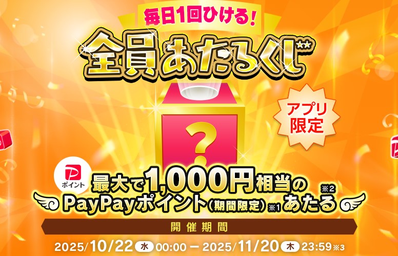 【毎日・アプリ】PayPayポイント最大1,000円相当がその場で当たる! 2025.10.28 2025.10.27Yahoo!オークション‐毎日1回ひける!全員あたるくじ 賞品:PayPayポイント(期間限定)最大1,000円相当 締切:2025年11月20日(木)アプリ内からご応募ください。※詳細はキャンペーンページにてご確認ください。応募はこちらから
