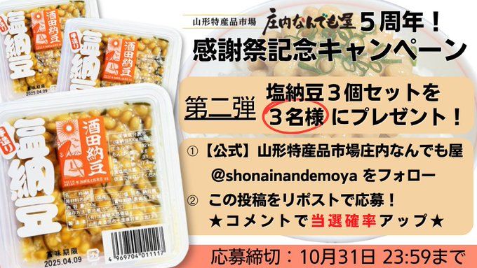 【X懸賞】塩納豆3個セットを3名様にプレゼント 2025.10.28庄内なんでも屋5周年感謝祭記念キャンペーン 賞品:塩納豆3個セット(3名様) 締切:2025年10月31日(金)公式X(Twitter)アカウントをフォロー&キャンペーン対象ポストをリポストしてご応募ください。※詳細はキャンペーンページにてご確認ください。応募はこちらから