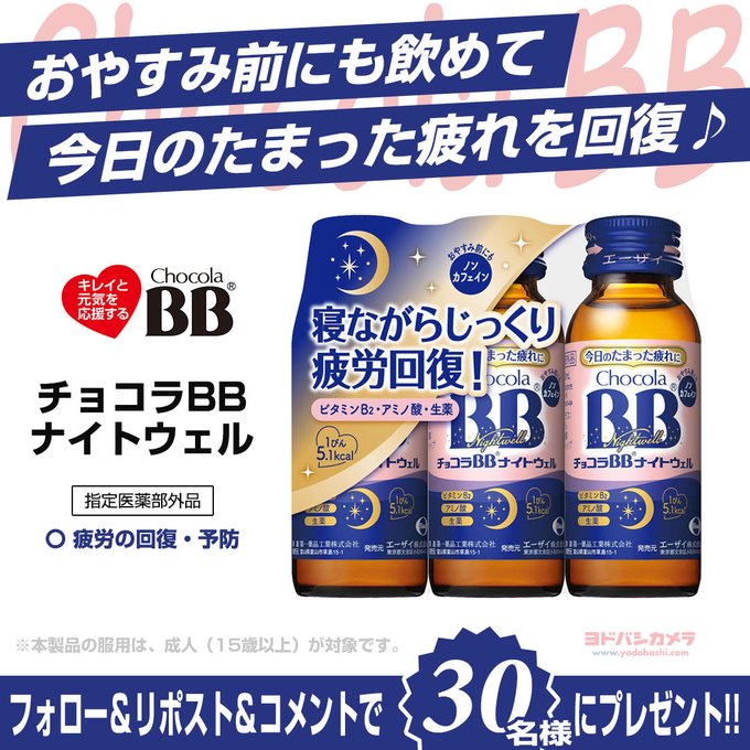 【X懸賞】エーザイ チョコラBBナイトウェル 50mL×3本を30名様にプレゼント 2025.10.29ヨドバシカメラ‐プレゼントキャンペーン 賞品:エーザイ チョコラBBナイトウェル 50mL×3本(30名様) 締切:2025年10月31日(金)フォロー&リポスト&コメントで 30名様にプレゼント🎁※詳細はキャンペーンページにてご確認ください。応募はこちらから