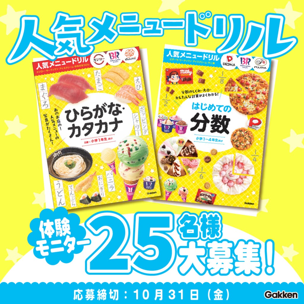 『人気メニュードリル スシロー・サーティワン アイスクリーム・はなまるうどん ひらがな・カタカナ』、『人気メニュードリル ピザーラ・サーティワン アイスクリーム・不二家 はじめての分数』の2冊を、実際にお使いいただき、「本書を使った感想」「本書を使用している画像や動画」をご自身のX(旧Twitter)かInstagramに投稿してくださるモニター様を募集中