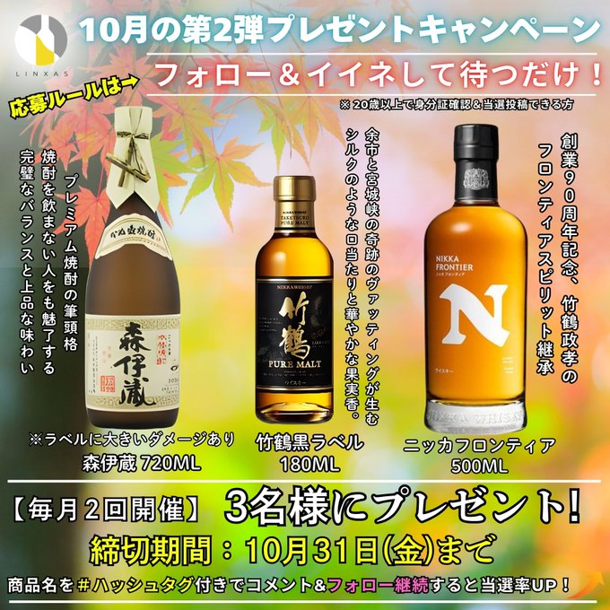賞品:#森伊蔵 #竹鶴 #ニッカフロンティア のいずれかの #高級酒(3名様)