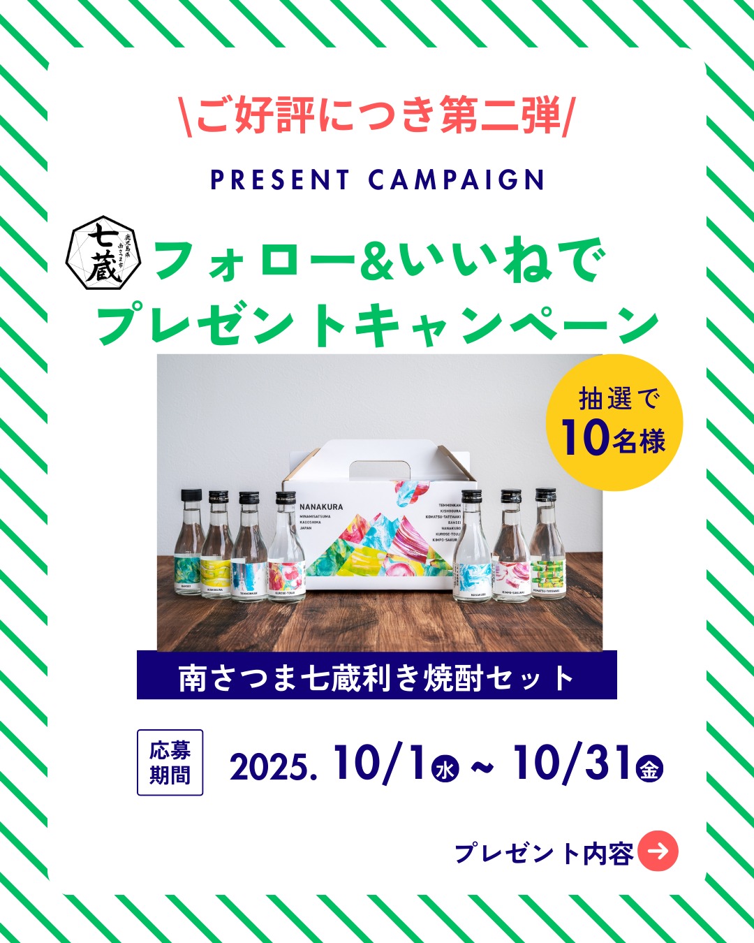 賞品:「南さつま七蔵利き焼酎セット」180㎖×7本(10名様)