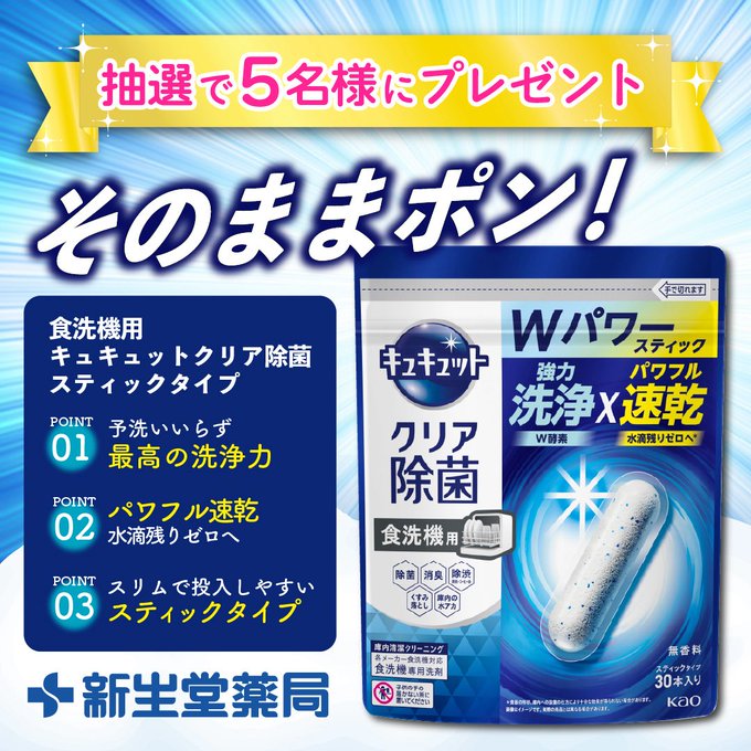 【X懸賞】キュキュットの食洗機用クリア除菌スティックを5名様にプレゼント 2025.10.29こうしき@新生堂薬局‐フォロー&リポストキャンペーン 賞品:キュキュットの食洗機用クリア除菌スティック(5名様) 締切:2025年10月31日(金)①@sinseidoをフォロー ②投稿にいいね※詳細はキャンペーンページにてご確認ください。応募はこちらから