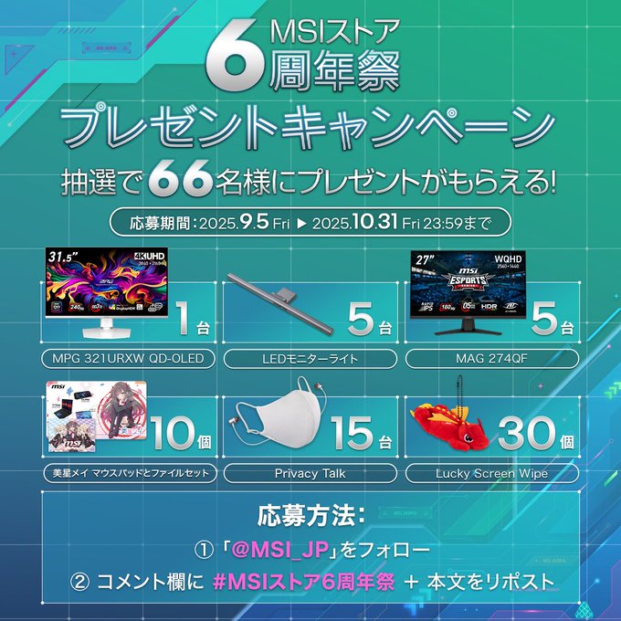② 投稿に #MSIストア6周年祭 をつけてリポスト