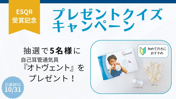 【X懸賞】自己耳管通気具『オトヴェント』を5名様にプレゼント 2025.10.30欧米のユニークで優れた医療機器の㈱名優‐ESQR受賞記念 賞品:自己耳管通気具『オトヴェント』(5名様) 締切:2025年10月31日(金)応募方法 Step1 フォロー&投稿をリポスト Step2 フォームから応募※詳細はキャンペーンページにてご確認ください。応募はこちらから