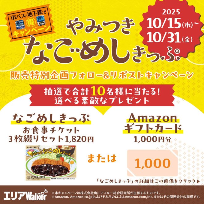 賞品:『やみつきなごめしきっぷ』お食事チケット3枚綴りセット、Amazonギフトカード1,000円分(合計10名様)