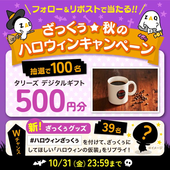 ハッシュタグ【ハロウィンざっくぅ】をつけて、ざっくぅにしてほしいハロウィンの仮装をリプライ(写真やイラストも◎)