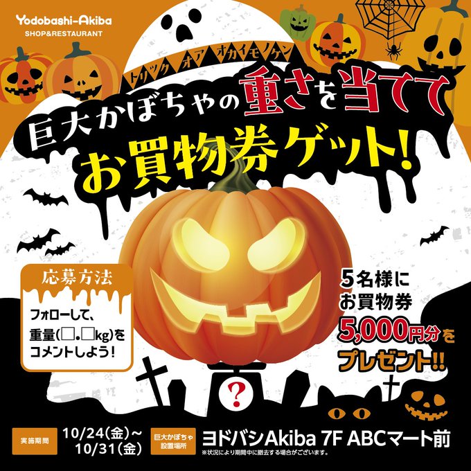 【X懸賞】お買物券5,000円分を5名様にプレゼント 2025.10.30ヨドバシAkiba‐ハロウィン企画 賞品:お買物券5,000円分(5名様) 締切:2025年10月31日(金)①@Yodo_Akihabaraをフォロー ②重さ(小数第一位まで)をコメント欄に記載※詳細はキャンペーンページにてご確認ください。応募はこちらから